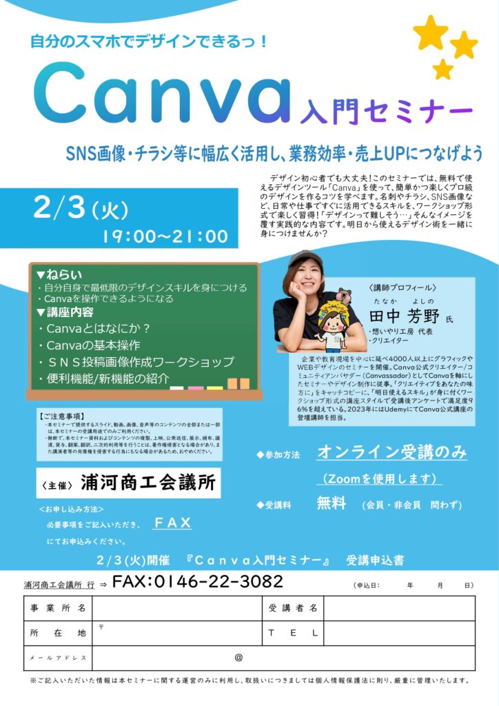 自分のスマホでデザインができるデザインツール「Canva」を使って、SNS投稿画像やチラシ作成を学び、業務効率や売上アップにつなげるセミナーを開催します